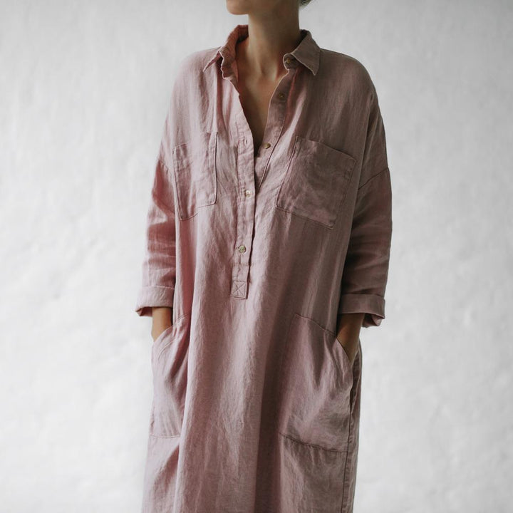 Lasciati conquistare da questo magnifico vestito in lino, perfetto per le giornate di sole! La sua linea fluida e il materiale naturale ti offrono una sensazione di leggerezza e freschezza senza pari.