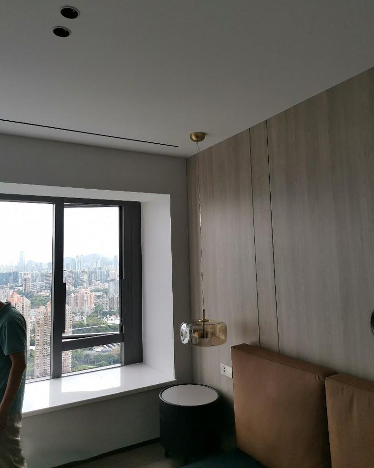 Rozświetl swoje wnętrze lampą wiszącą AuraGlass. Jej wyrafinowany design ze szkła dmuchanego tworzy ciepłą i wyrafinowaną atmosferę. Idealna do salonu, jadalni lub sypialni, ta lampa pasuje do każdego stylu.