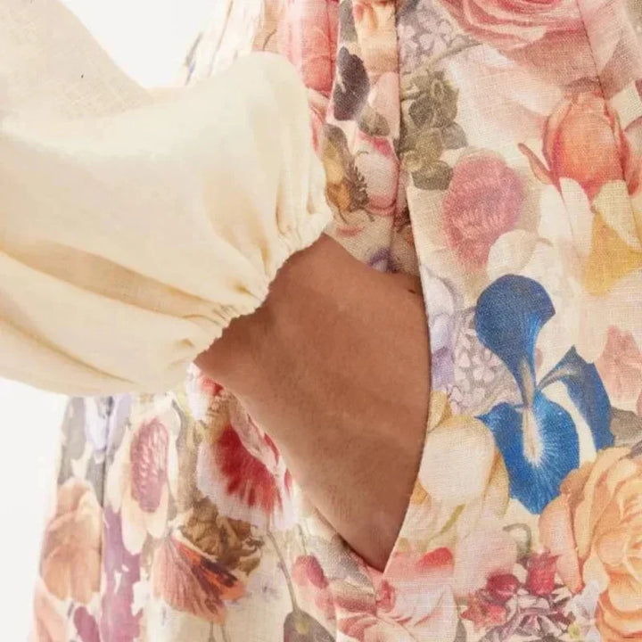 Zakochaj się w tej uroczej kwiatowej sukience midi, idealnej na wiosenne i letnie wydarzenia. Jej wielokolorowy kwiatowy wzór na kremowym tle wnosi do Twojej garderoby świeżość i elegancję. Pochlebny krój delikatnie podkreśla sylwetkę.